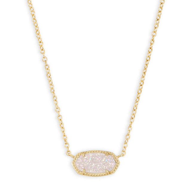 Kendra Scott Elisa Gold Iridescent Drusy Discover the stunning natural beauty of iridescent drusy with the Kendra Scott Elisa Gold necklace. This eye-catching accessory will add a touch of elegance to any outfit with its hand-finished 14k gold plating and one-of-a-kind stone. Expertly crafted and versatile, the Elisa necklace is the perfect addition to your jewelry collection.