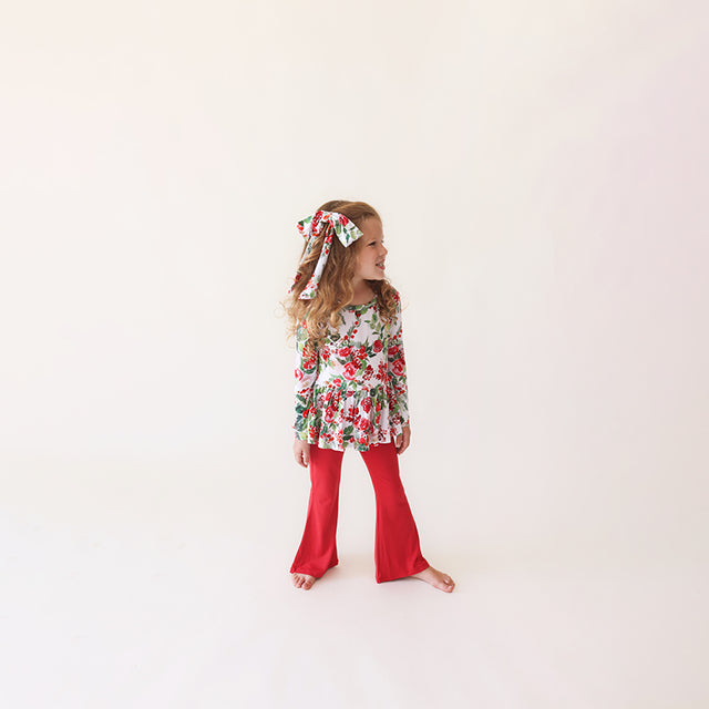 This stylish outfit features a long sleeve peplum top and bell bottoms, making it the perfect combination of fashion and comfort. Crafted with high-quality materials, these pieces provide lasting wearability and are designed to keep up with your child's active lifestyle. With Posh Peanut Inc., you can trust in the quality and functionality of our products for your little one.