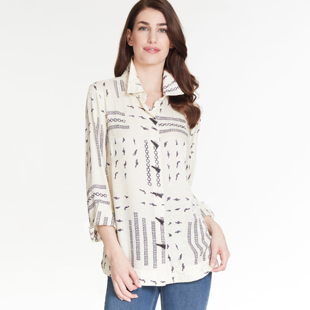 This Multiples top features a shimmering print, with turn-up button front cuffs and 3/4 length sleeves. Convenient, stylish, and versatile, it's the perfect addition to your wardrobe. A timeless silhouette you can mix and match to suit your own style. Add a playful touch of texture for day or night.