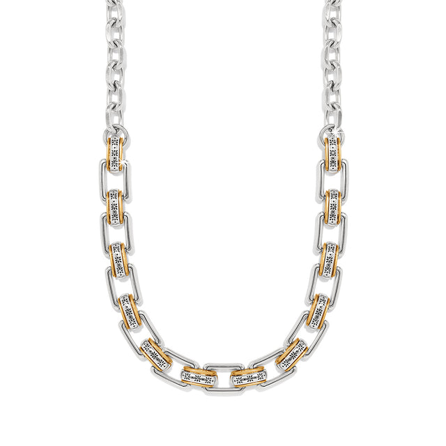 Add some playful panache to your look with this exquisite necklace. With its distinctive and unique design, you'll be sure to stand out from the crowd. Plus, the two-tone links add a touch of versatility, making this necklace perfect for any occasion. It's a must-have piece for any jewelry collection!