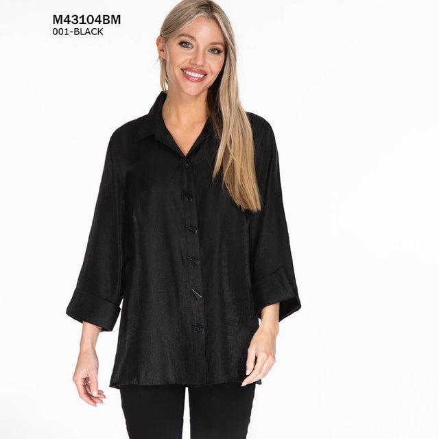 Black Turn-Up Cuff 3/4 Sleeve Hi-Lo Solid Shimmer Shirt